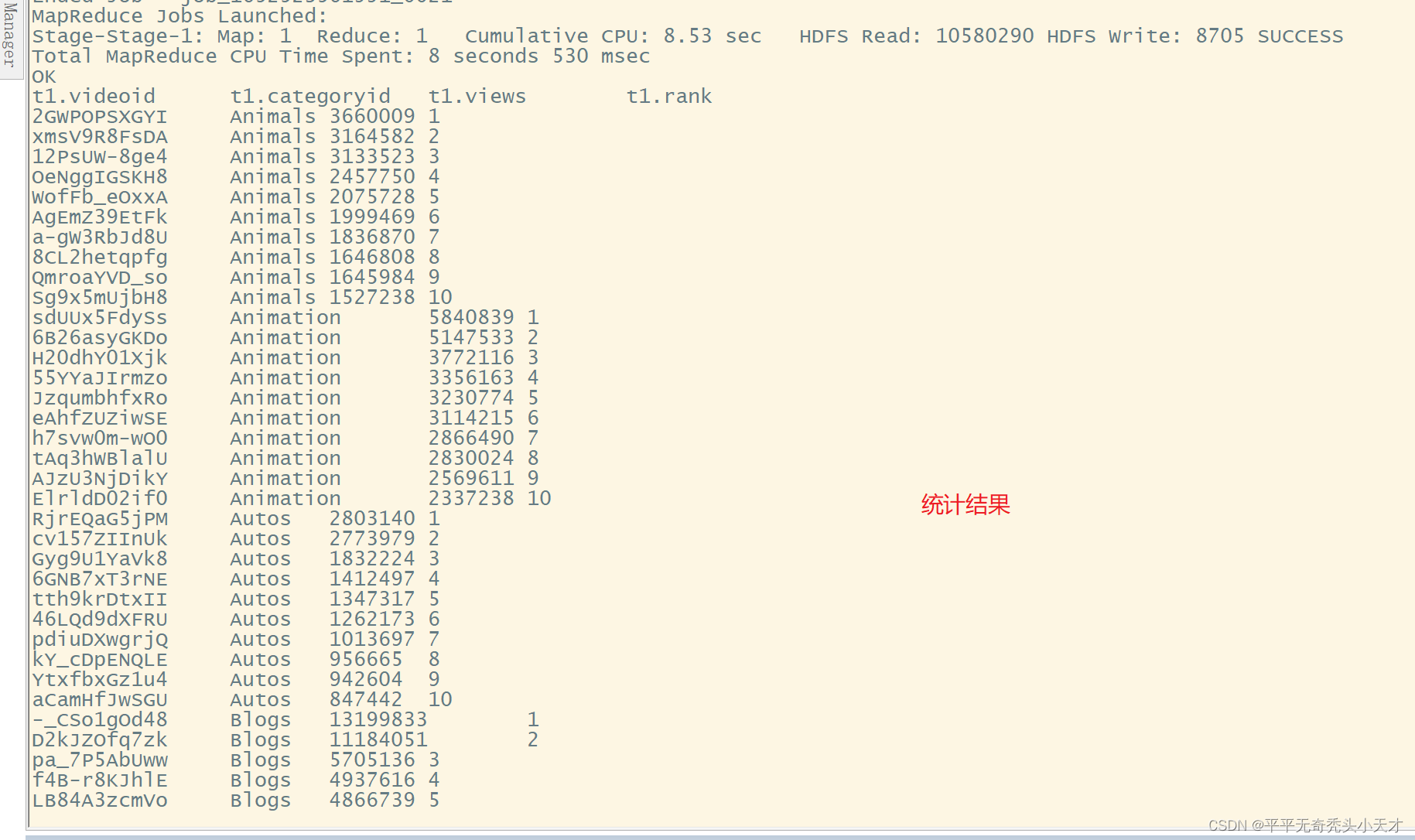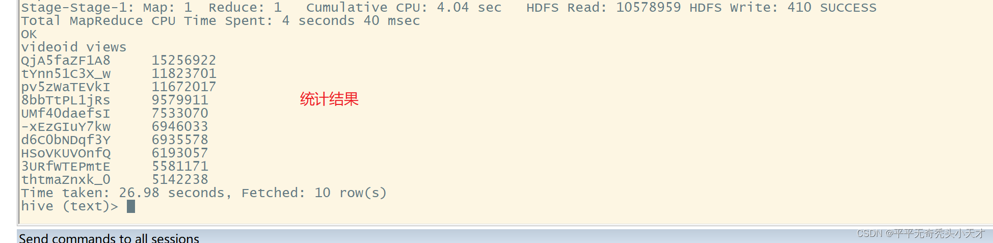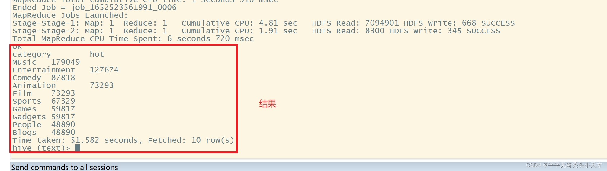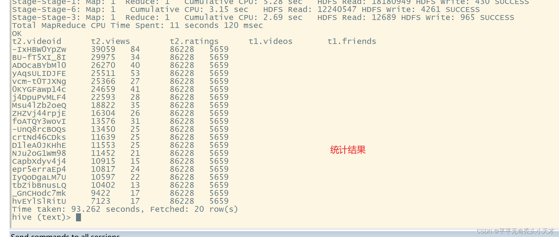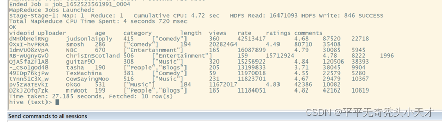 hive (text)> select videoId,uploader,age,category,length,views,rate,ratings,comments from gulivideo_orc order by views desc limit 10;