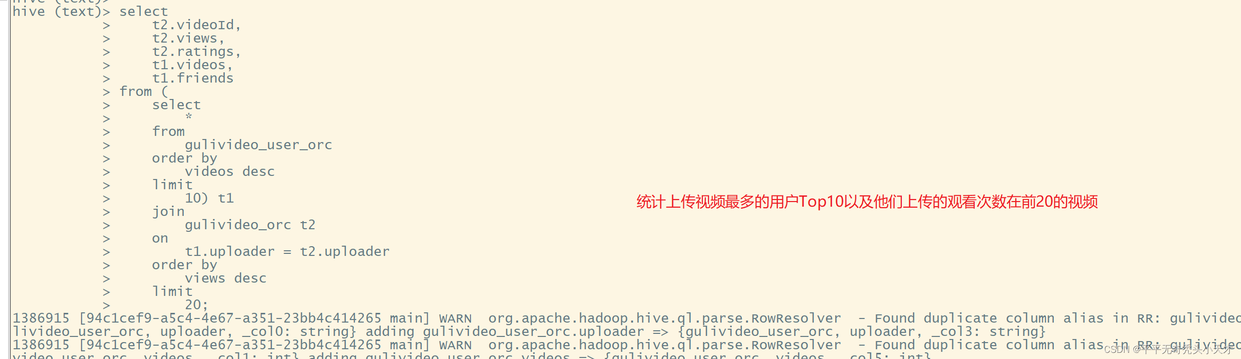 7.统计上传视频最多的用户Top10以及他们上传的观看次数在前20的视频