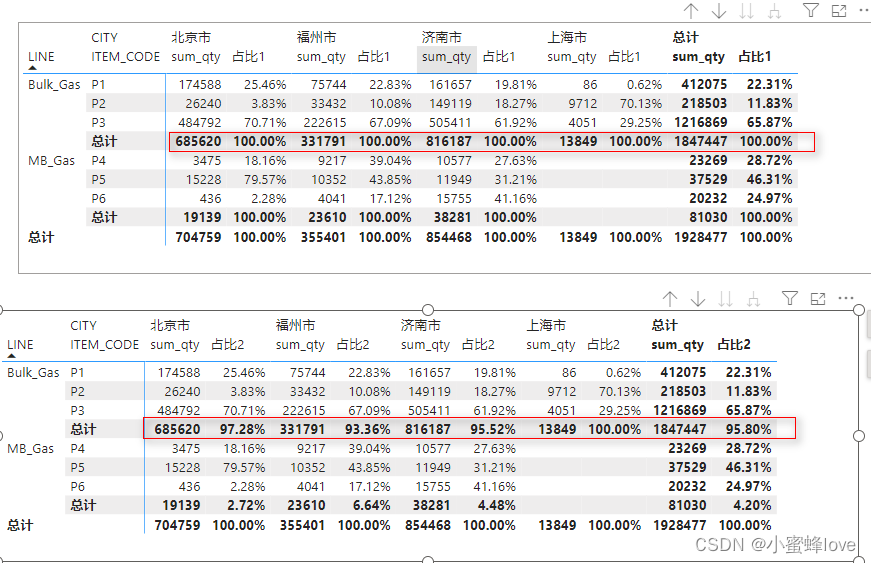 占比1 = DIVIDE([sum_qty], CALCULATE([sum_qty],ALLSELECTED('Item'[ITEM_CODE]))) //按照line为一个整理展示数据