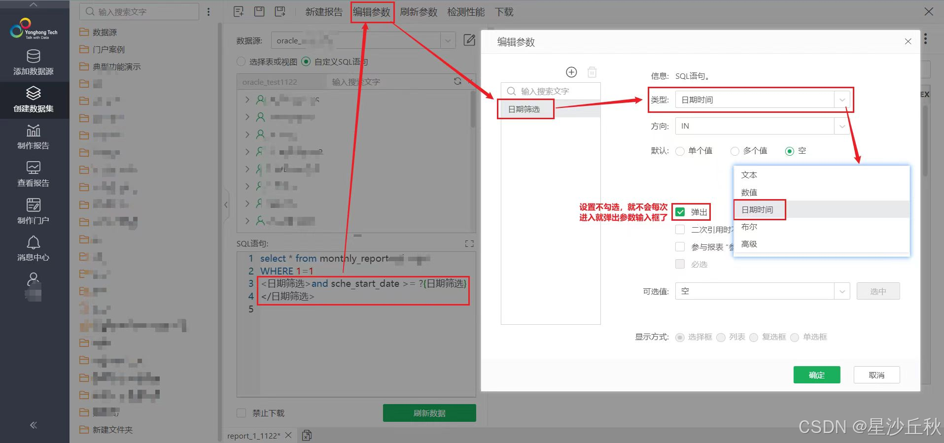 在报告中,先设置文本参数组件-日期模式来传日期值,再要在SQL语句(Oralce)中如下图所示直接使用该参数来调用,最后数据集中设置该参数的类型为日期类型(注意,前一步中就不要将参数由文本格式转为日期格式了(to_date函数),否则报错;反过来,前一步用了to_date(),这一步就不需要设置)。