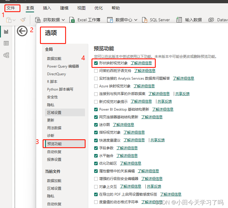 首先要放出“形状地图”这个视觉对象,按照“文件-选项-预览功能-形状映射视觉对象”路径勾上形状映射视觉对象,重新进入POWERBI就会多出“形状地图”这个视觉对象。
