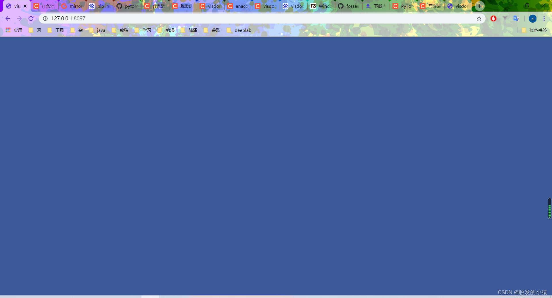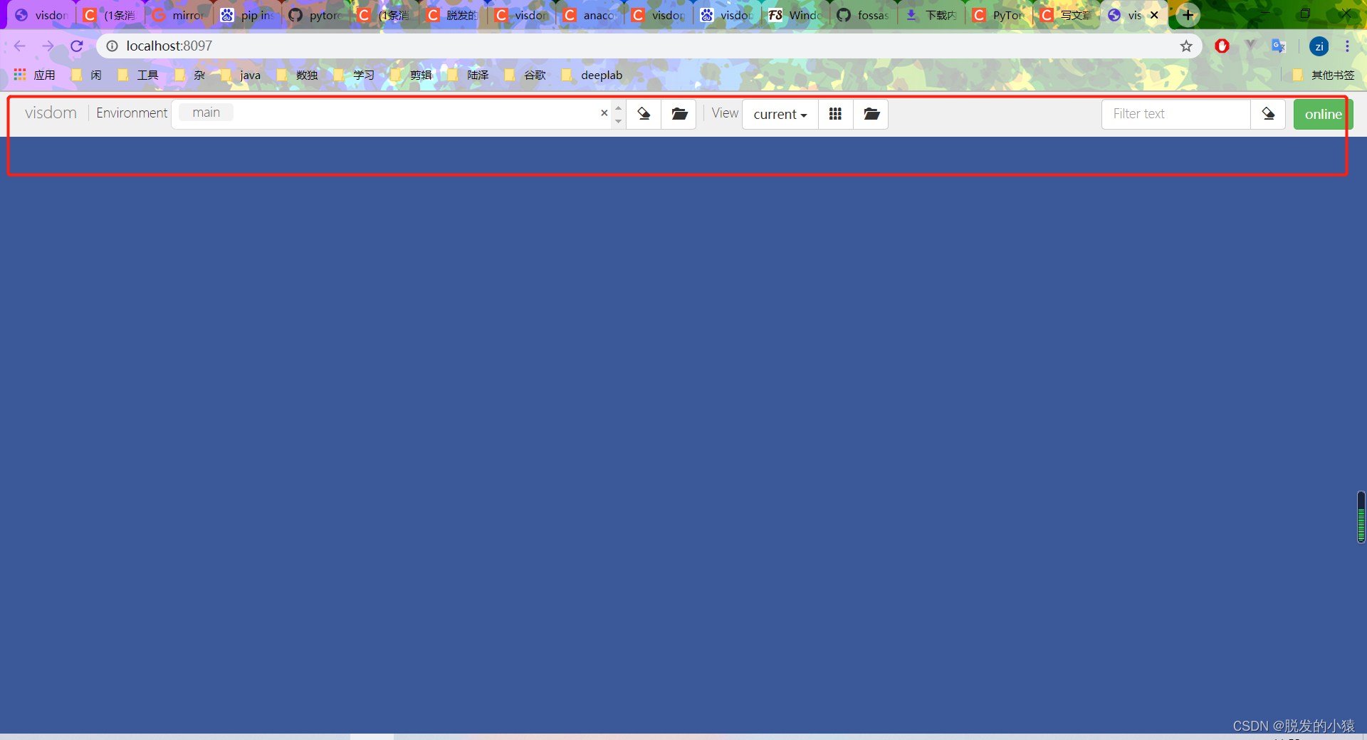 1、问题:在使用visdom的时候发现浏览器是蓝色的,没有toolbar和窗口(蓝屏)如下: