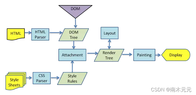第二点,HTML和CSS作为浏览器渲染引擎的一部分,为了完成页面渲染的工作,除了绘制图形外,还要做很多额外的工作。如下是浏览器的渲染过程: