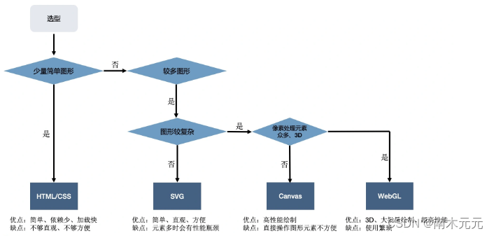 在现代浏览器中实现可视化的绘制技术主要有4种:HTML+CSS、Canvas2D、SVG、WebGL。