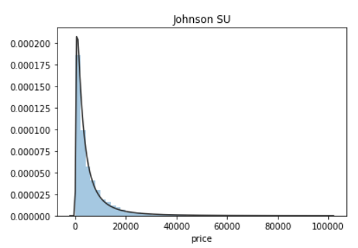 从上图可知,横轴表示样本的各个价格,纵轴表示这一价格对应的样本数量与样本总数的比值。第一个图中的曲线拟合情况最好,所以预测值服从无界约翰逊分布,而不是服从正太分布。关于无界约翰逊分布(JohnsonSUDistribution)一些信息。