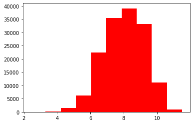 plt.hist(np.log(Train_data['price']), orientation='vertical', histtype='bar', color='red')