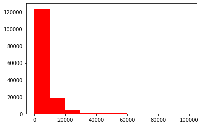 plt.hist(Train_data['price'], orientation='vertical', histtype='bar', color='red')