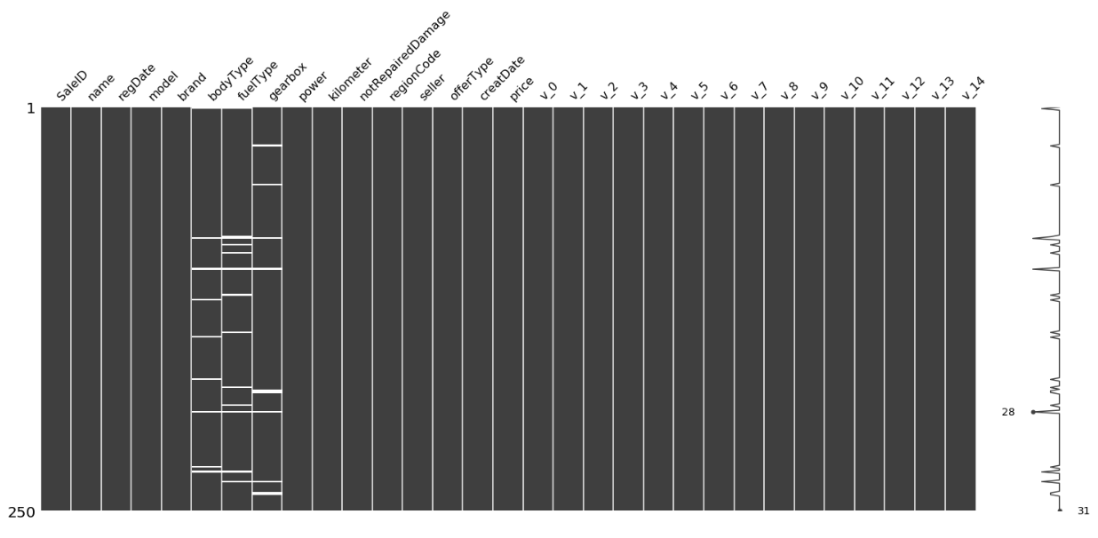 上图中,左边的纵轴从上至下表示第1-250个样本,当一列中出现白色横线时,表示这个样本的这个特征的值有缺失,然后在右侧的纵轴上便会有一个波动,波动越大,说明此条样本缺失的特征越多。在右侧的纵轴上会标出完整性最大的点和最小的点,上图中的28应该表示第28个样本的完整性最小,即缺失的特征最多。