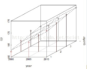 s3d <- scatterplot3d(year, quarter, cpi, highlight.3d=T, type="h", lab=c(2,3))