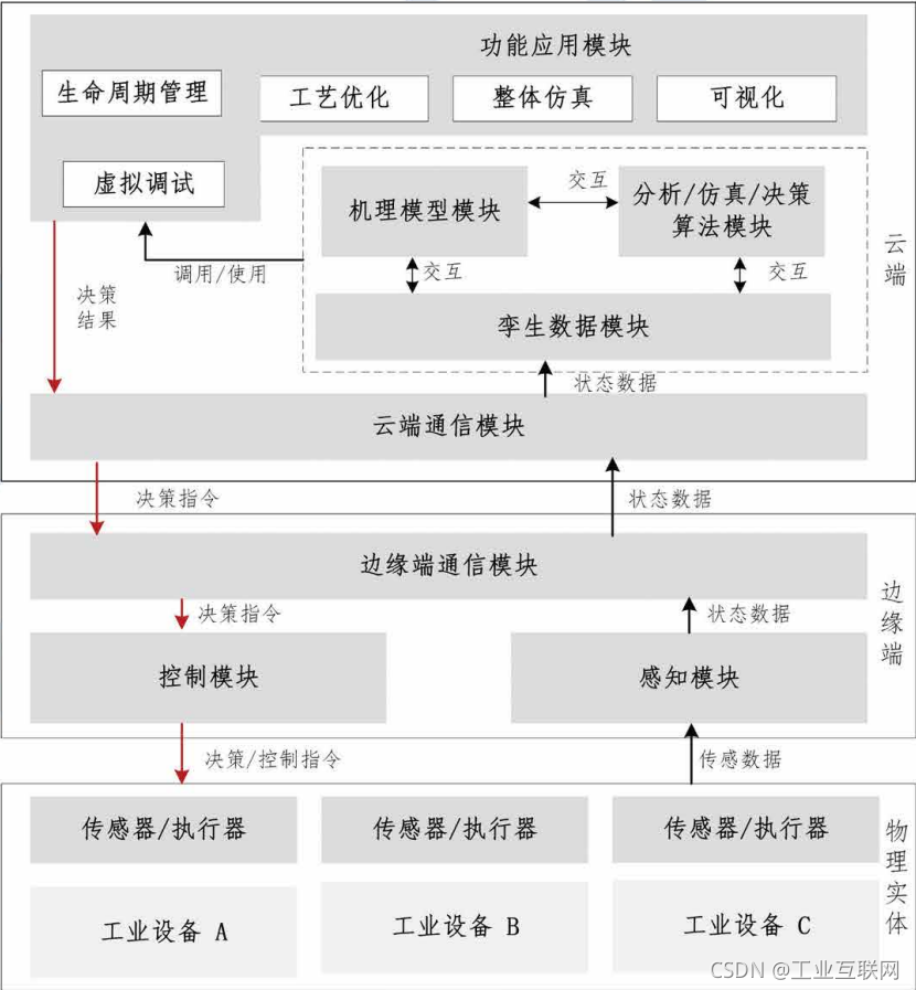 系统运行过程中,物理空间的传感系统通过边缘端的感知模块和边缘通信模 块以及云端通信模块,经预处理后,传输至拳生数据模块进行归档和使用。机理 模型模块可根据拳生数据模块的设备实时状态数据进行更新迭代。功能应用模块 根据机理模型和拳生数据,通过分析/仿真/决策算法,进行分析、仿真和决策。决 策结果通过云端通信模块和边缘端通信模块,传输至边缘端,通过边缘端控制模 块控制物理实体执行。