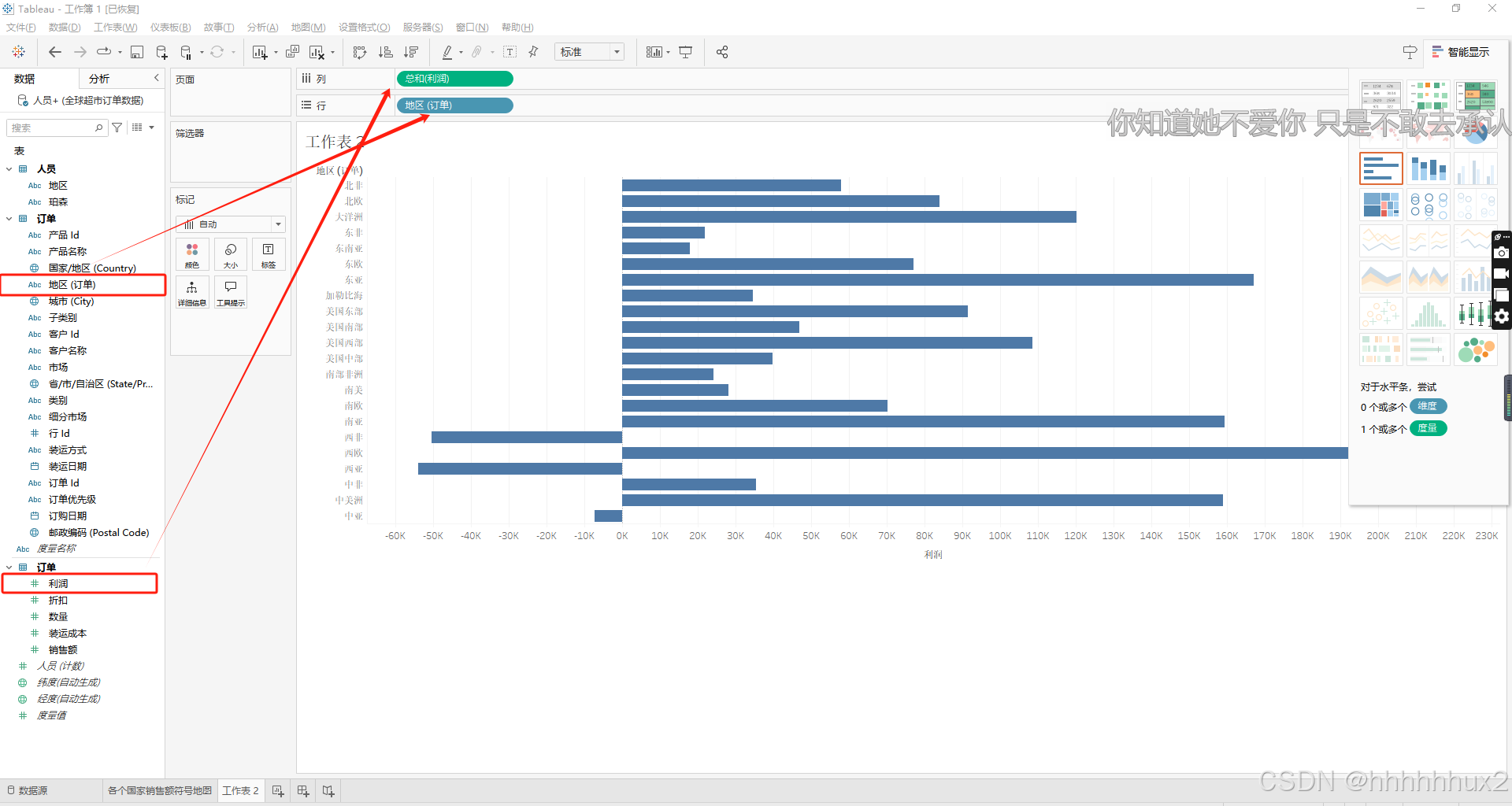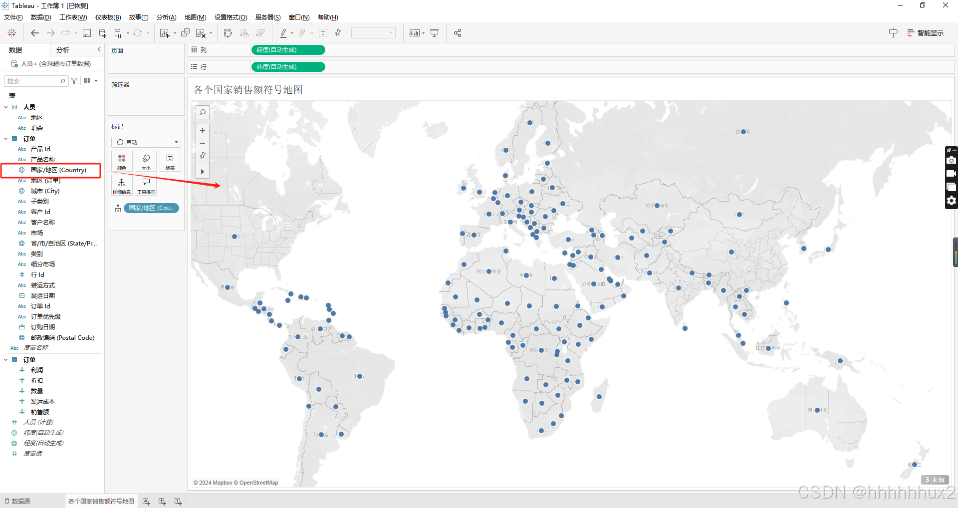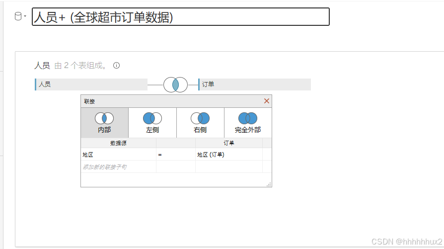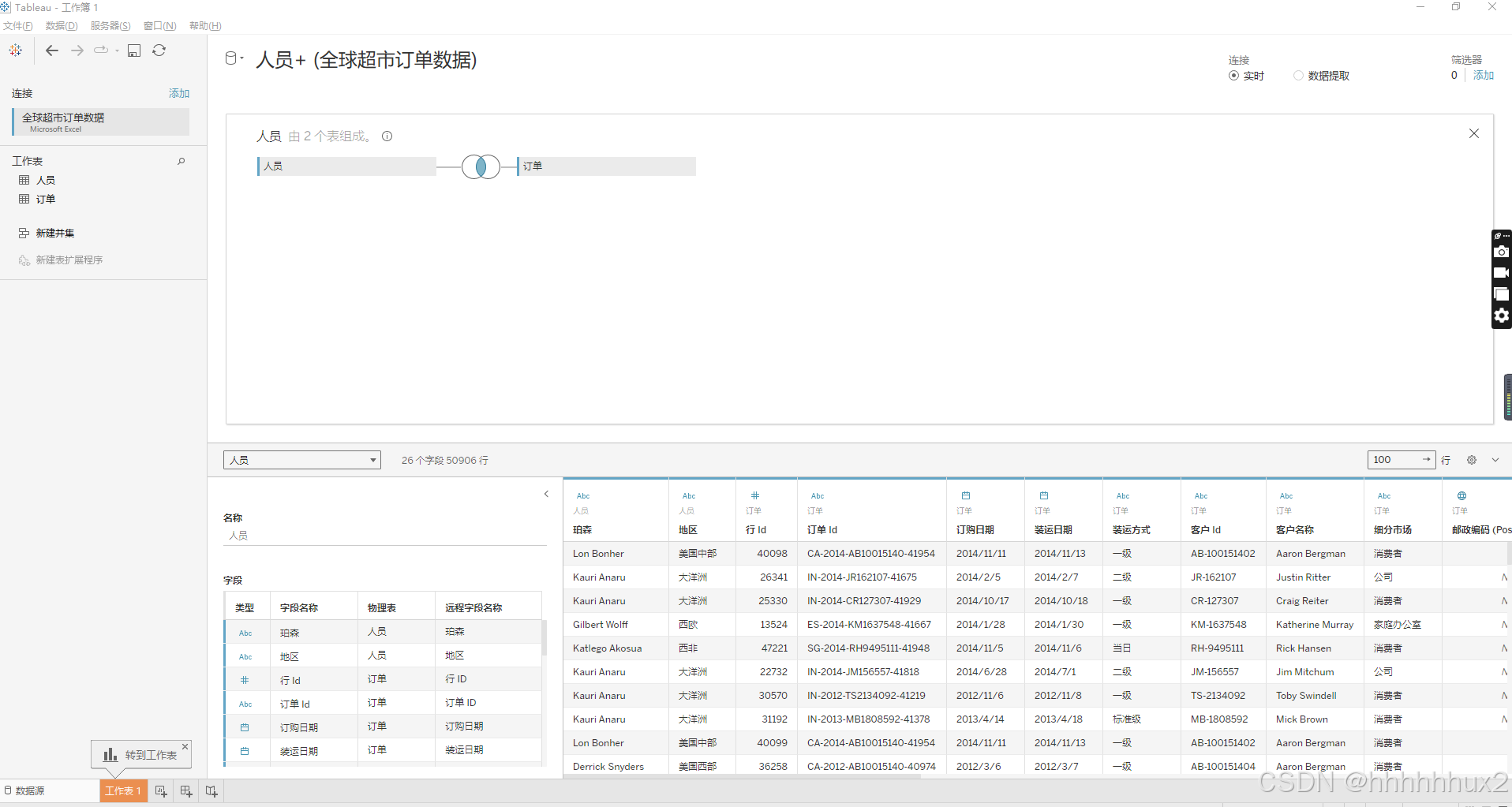 首先导入全球超市订单数据,将人员数据拖拽到工作表,双击拖拽到工作表的人员工作表,然后在拖拽订单工作表