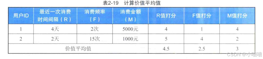 分别计算出R值打分、F值打分、M值打分这3列的平均值,如表所示