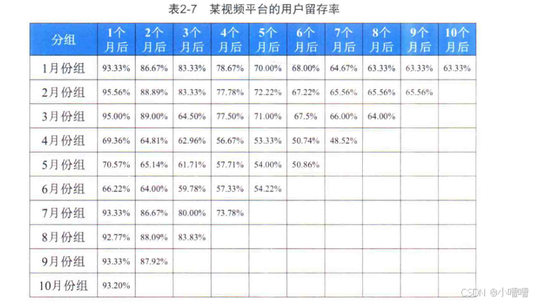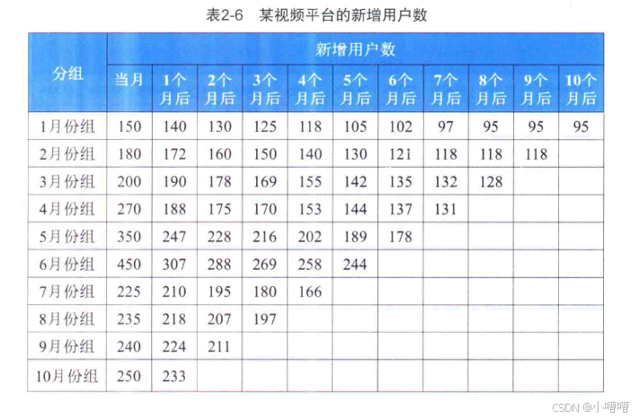通常是按用户开始使用产品的月份来分组,例如用户注册的那个月或者第1次购买的那个月。