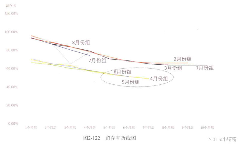 把每个组的数据绘制成一条折线,横轴是时间,纵轴是留存率,然后比较各个组的折线。因为9月份组和10月份组的数据很少,所以没有绘制到图上。从图中可以发现,当1、2、3月份组的折线趋于平稳时,4、5、6月份组的折线还在继续下行。