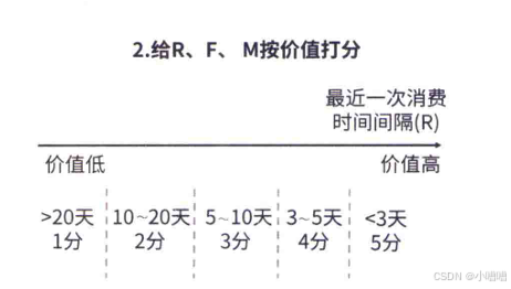 这个案例里,对于最近1次消费时间间隔(R),大于20天的打1分,10~20天的打2分,5~10天的打3分,3~5天的打4分,3天以内打5分。