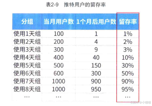 “分组”这一列是某月份用户使用推特的天数,“当月用户数”这一列是对应这组里有多少用户,“1个月后用户数”是1个月后,有多少人留存下来继续使用产品。这样分组后,用“1个月后用户数”除以“当月用户数”,就可以得到各组的留存率。
