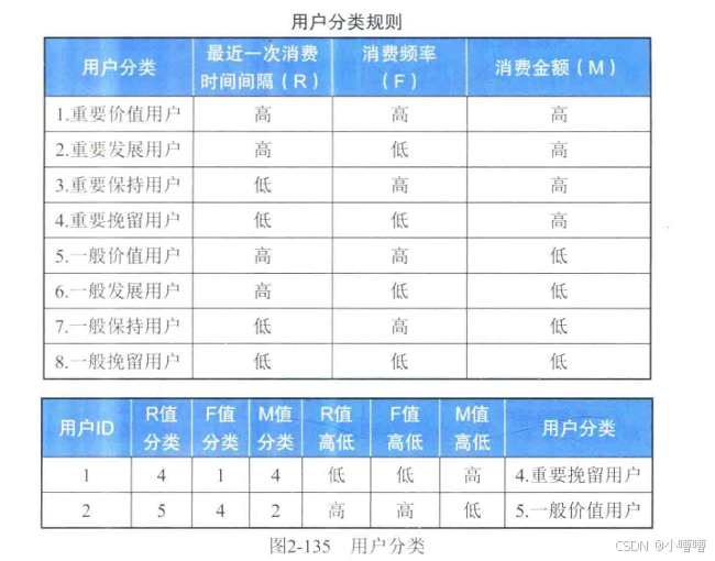 此外,FRM打分的规则可以与业务部门沟通,进行头脑风暴。或者使用聚类的方法对R、F、M的值进行分类,然后给每个类别打分。