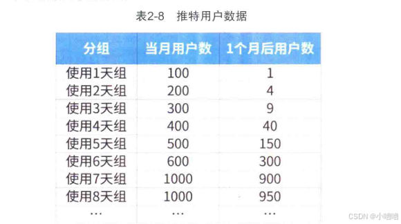 当时,推特面临的是很多人注册后就不再使用产品了,留下来的活跃用户极少。为什么用户留存率低呢?为了解决这个问题,团队按每月使用推特的天数对用户进行分组分析。由于没有当时的真实数据,为了方便理解,表中的数据是模拟数据。