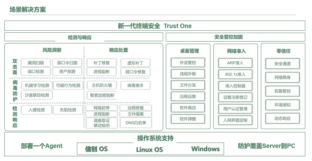 一个客户端融合防病毒、虚拟补丁、EDR、桌管、SDP、网络准入等多项能力,覆盖信创和非信创系统。