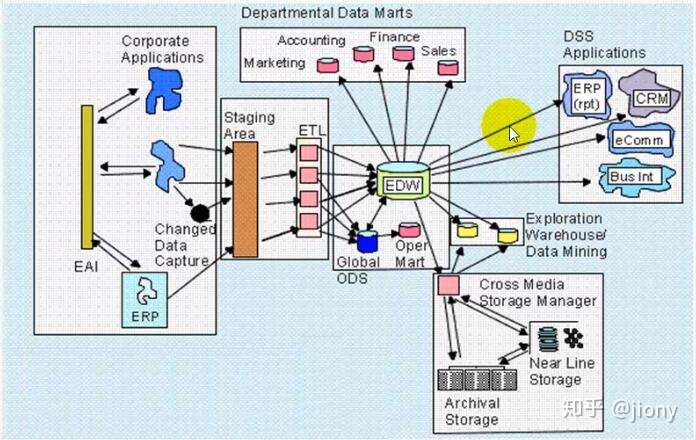 Inmon强调自顶向下。先将来自各个源业务系统数据集成至企业级的数据仓库,再基于其搭建面向部门应用需求的数据集市。