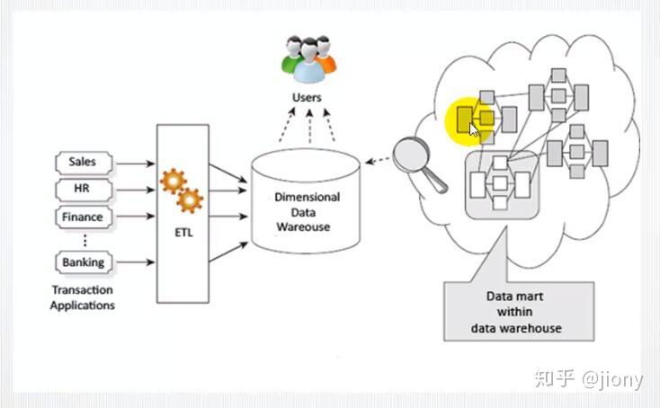 Kimball支持数据仓库总线结构,提倡维度建模,以星形模型或是雪花模型等方式构建维度数据仓库。架构体系中,数据集市与维度数据仓库是紧密结合的,数据集市是数据仓库中一个逻辑上的主题域。各种前端工具将可以直接访问使用维度数据仓库。