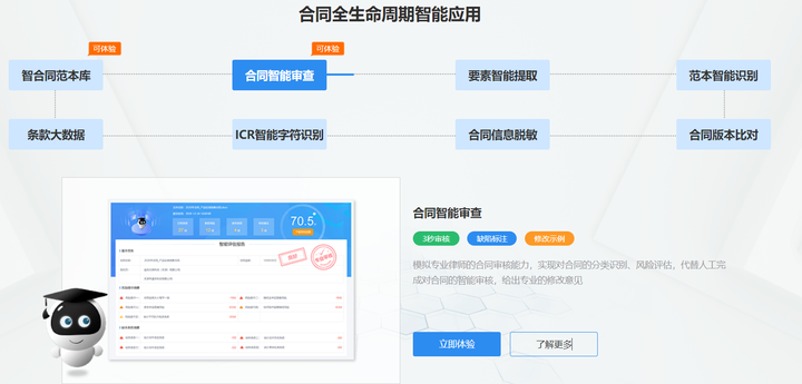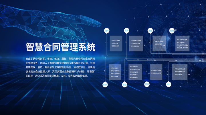 该平台涵盖了合同从起草、审核、签订、履行、归档完整合同全生命周期的管理业务。借助人工智能引擎实现合同法律风险自动识别、合同要素提取、履约计划自动生成等智能化功能。同时,智慧合同管理平台还拥有海量大数据辅助——10000+份合同范本、1000万+合同审核经验、 10万+律师数据资源以及海量国内外法律资源,可帮助企业合同管理水平提升70%,风险发生概率降低40%,异常履约率降低40%,合同审核用时减少50%,管理效率提升100%,签订签 约周期缩短90%,平均节省50%合同管理资金成本,真正实现企业数据资产“内增效、外增值”的目标,为企业决策层提供精准、立体、全方位的数据依据。