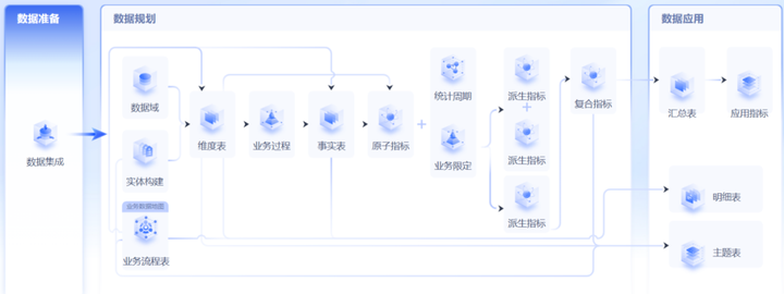 OceanMind海睿思依托于大数据平台能力,构建指标管理平台,从数据集成开始,到数据的质量管理,再到数据分层、指标体系管理,最后到指标应用,为企业指标建设提供端到端的支撑。