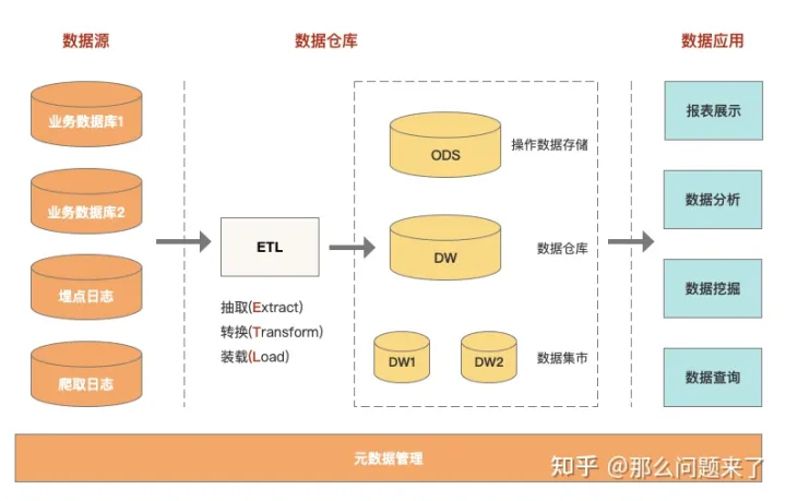 分别是:数据仓库技术、Hadoop。当数据为结构化数据,来自传统的数据源,则采用数据仓库技术来存储和处理这些数据,如下图: