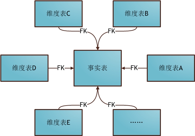 星形模式(Star Schema)是最常用的维度建模方式,下图展示了使用星形模式进行维度建模的关系结构: