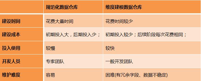 规范化数据仓库和维度建模数据仓库分别是Bill Inmon和Ralph Kimball提出的方法。关于哪种方法更好,哪种方法更优秀的争论已经由来已久。但随着这两种数据仓库应用越来越多,人们也逐渐了解到两种数据仓库的优劣之处,如下表所示: