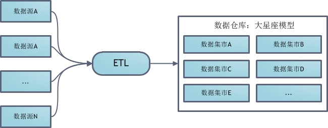 该建模体系首先设计一组常用的度集合(conformed dimension),然后创建一个大星座模型表示所有分析型数据。如果这种一致维度不满足某些数据分析要求,自然也可在数据仓库之上继续构建新的数据集市。