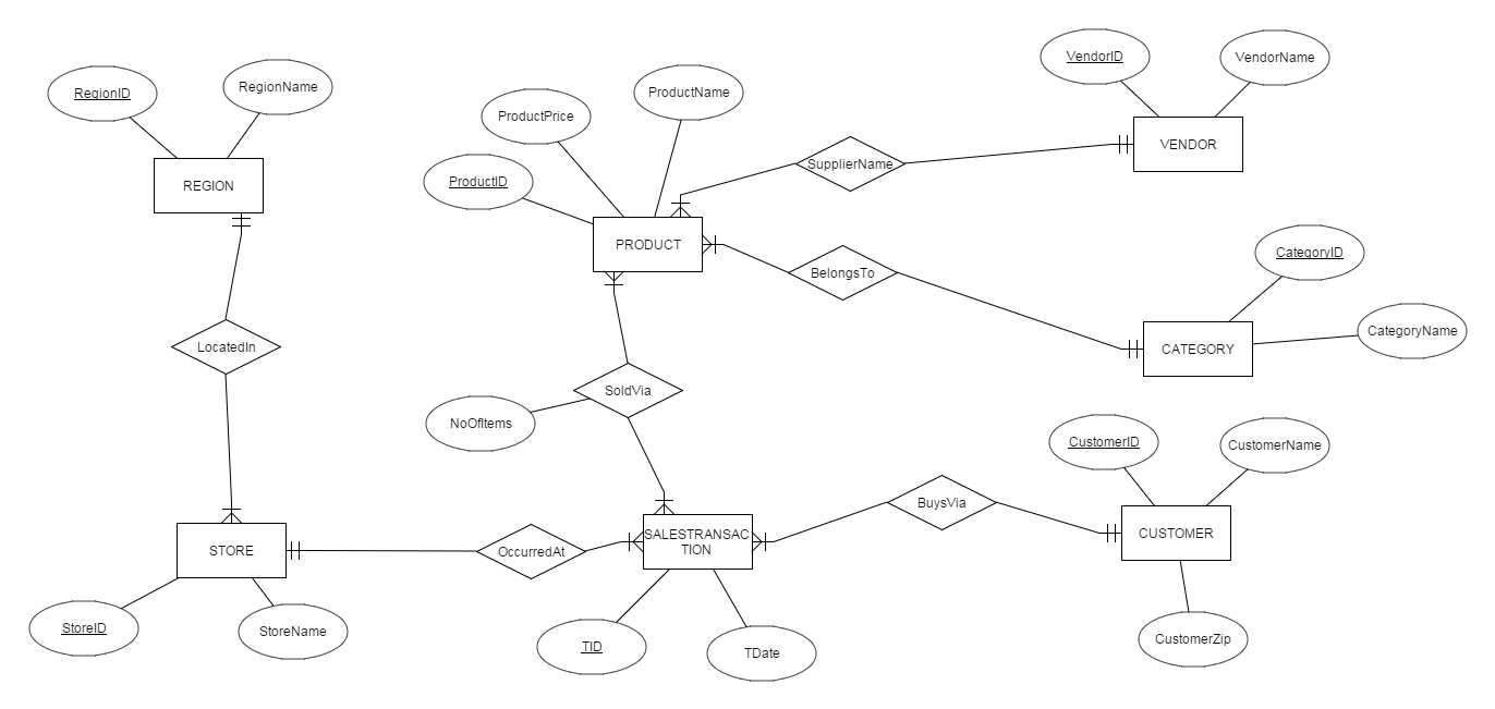 在进行维度建模前,首先要了解用户需求。而笔者在数据库系列的第一篇就讲过,ER建模是当前收集和可视化需求的最佳技术。因此假定和某零售公司进行多次需求PK后,得到以下ER图: