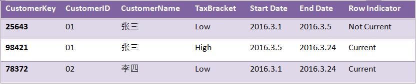 可以看到用户张三对应新维度的TaxBracket状态由Low变成了High。如果需要统计张三的相关行为,那么可以让所有记录用CustomerID字段Join事实表;如果要统计当前TaxBracket为Low的用户状态,则可将Row Indicator字段为Current的记录用CustomerKey字段Join事实表;如果要统计历史TaxBracket状态为Low的用户情况,则只需要将TaxBracket属性为Low的用户记录的CustomerKey属性与事实表关联。