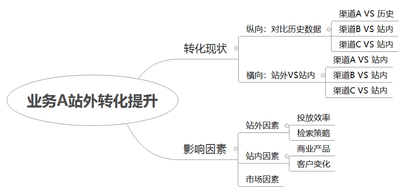 这一案例中,核心的问题是提升业务 A 站外流量收入、效果转化效率。第一步我们要明确当前的转化水平和影响转化的因素,围绕这两点细拆:
