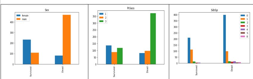 条形图显示了幸存乘客和未幸存乘客的特定特征(性别、船舱等级或兄弟姐妹配偶数量)的分布。蓝色条表示幸存乘客的数量,橙色条表示未幸存乘客的数量。