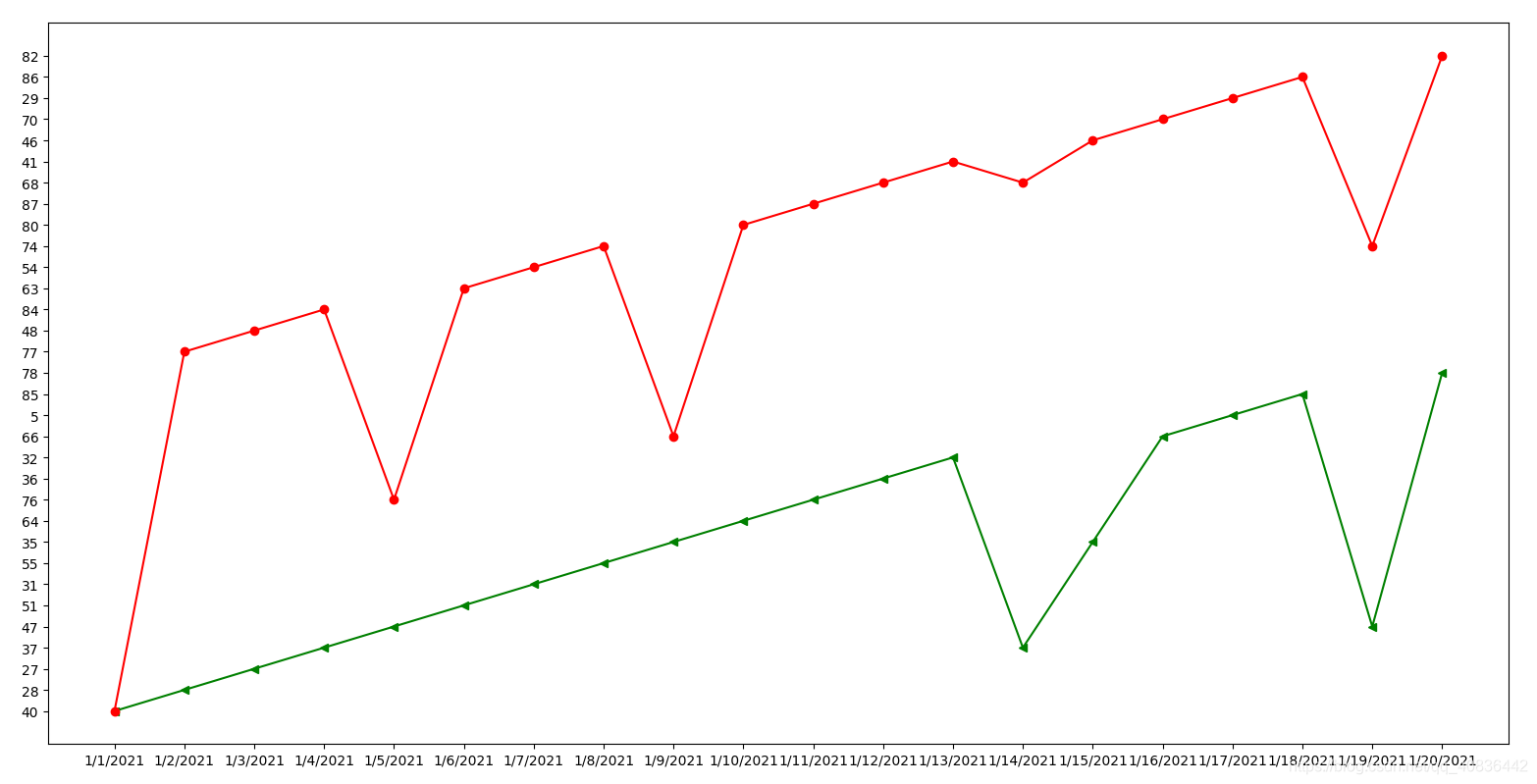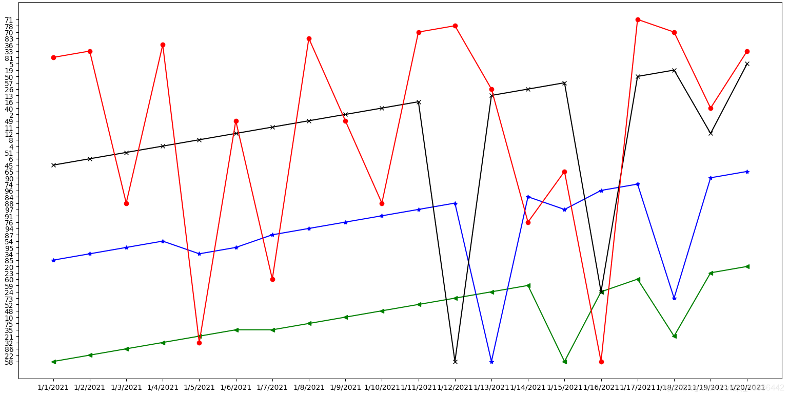 折线图函数的配置和散点图相似。由于没有找到上证指数000001.SH.csv文件,所以我随机生成了一个000001.SH.csv文件。plot()函数是生成普通的折线图,plot_date()函数生成横轴为日期的折线图,plot_date()函数中默认生成的是点图,需要加上fmt=‘-’就会变为折线图。color指定点的颜色,marker指定点的形状。一张图中可以画等多个折线图,如下图所示。