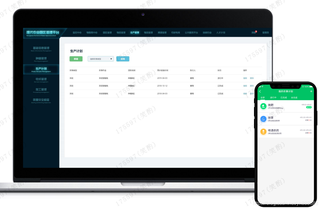 - 种植计划、施肥计划、农药使用、收获计划、加工过程、质量安全检查等生成工单。