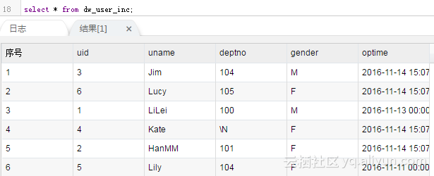 备注说明:本文的测试时间是2016-11-14,全量同步是在14号做的,同步历史数据到ds=20161113这个分区里。至于本文涉及的增量同步的场景,配置了自动调度,把增量数据在15号凌晨同步到ds=20161114的分区里。数据里有一个时间字段optime,用来表示这条数据的修改时间,从而判断这条数据是否是增量数据。