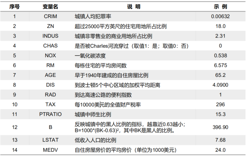 - 每条数据14个字段,包含13个属性,和1个房价的平均值