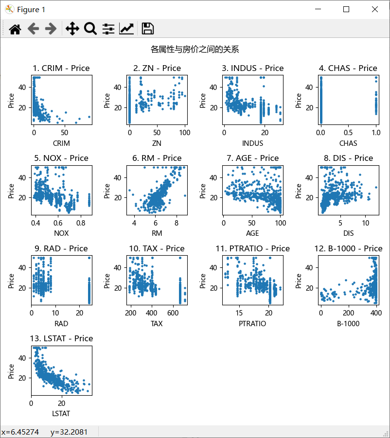 波士顿房价数据集卡内基梅隆大学,StatLib库,1978年涵盖了麻省波士顿的506个不同郊区的房屋数据404条训练数据集,102条测试数据集每条数据14个字段,包含13个属性,和1个房价的平均值目标将所有属性与房价之间的关系可视化代码import matplotlib.pyplot as pltimport numpy as npimport tensorflow as tfplt.rcPara