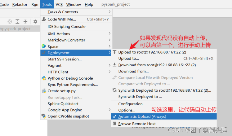 远程连接方案, 允许所有的程序员都去连接远端的测试环境, 确保大家的环境都是统一的, 避免各种环境问题的发生,而且由于是连接的远程环境, 所有在pycharm编写代码 都会自动上传到远端服务器中, 在执行代码的时候, 相当于是直接在远端环境上进行执行操作
