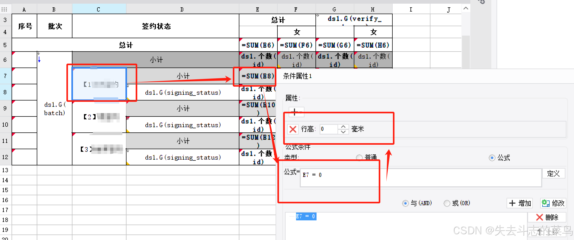 我这里设计的表格C7单元格设置了条件:如果E7=0的时候会设置行高为0【即隐藏该行】,