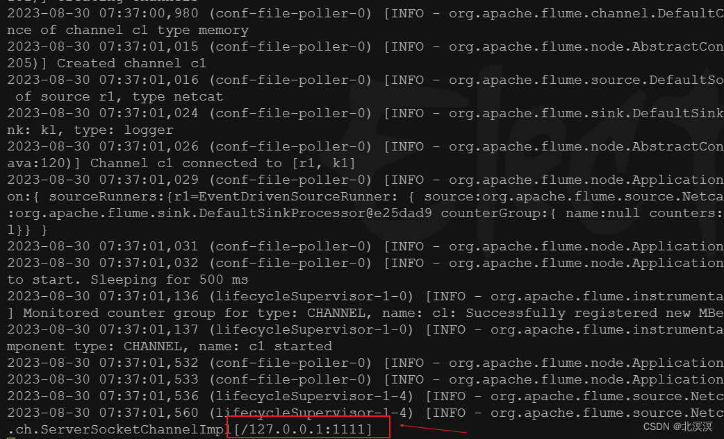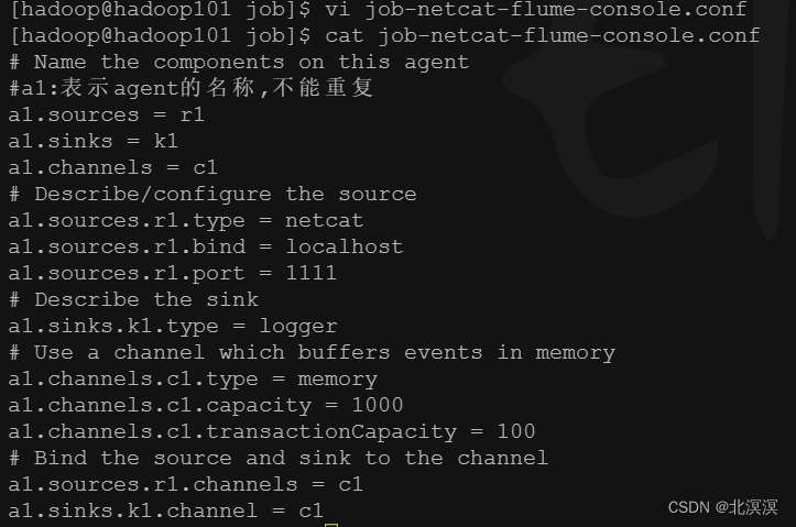 # Name the components on this agent #a1:表示agent的名称,不能重复 a1.sources = r1 #r1:表示a1的Source的名称 a1.sinks = k1 #k1:表示a1的Sink的名称 a1.channels = c1 #c1:表示a1的Channel的名称 # Describe/configure the source a1.sources.r1.type = netcat #表示a1的输入源类型为netcat端口类型 a1.sources.r1.bind = localhost #表示a1的监听的主机 a1.sources.r1.port = 1111 #表示a1的监听的端口号 # Describe the sink a1.sinks.k1.type = logger #表示a1的输出目的地是控制台logger类型 # Use a channel which buffers events in memory a1.channels.c1.type = memory #表示a1的channel类型是memory内存型 a1.channels.c1.capacity = 1000 #表示a1的channel总容量1000个event a1.channels.c1.transactionCapacity = 100 #表示a1的channel传输时收集到了100条event以后再去提交事务 # Bind the source and sink to the channel a1.sources.r1.channels = c1 #表示将r1和c1连接起来 a1.sinks.k1.channel = c1 #表示将k1和c1连接起来