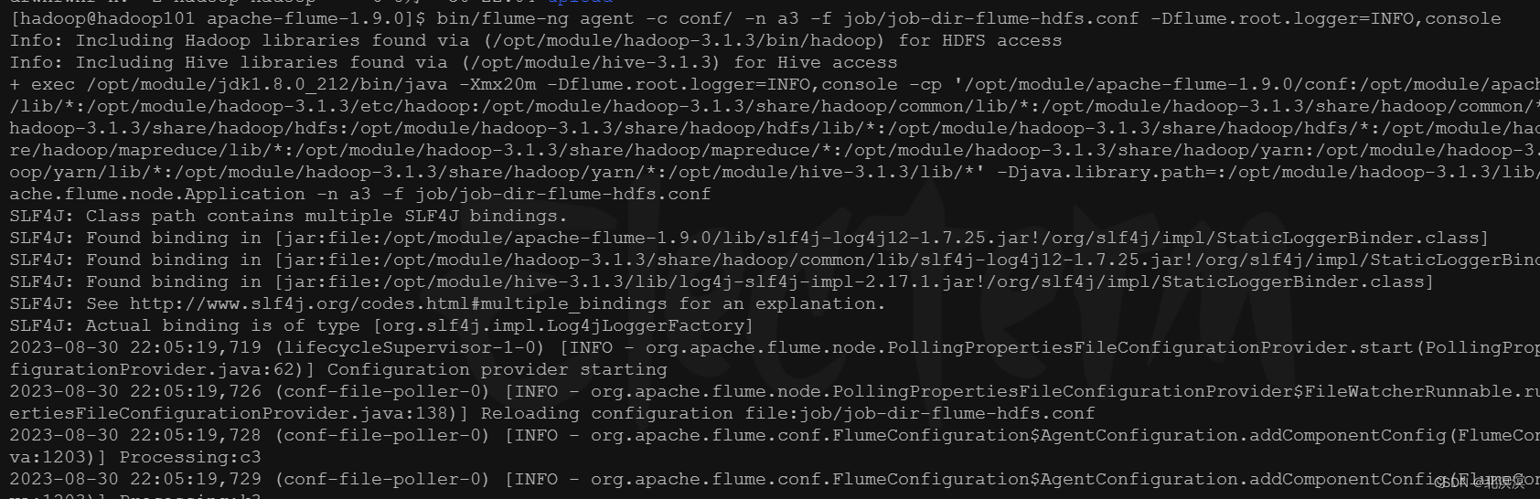 bin/flume-ng agent -c conf/ -n a3 -f job/job-dir-flume-hdfs.conf -Dflume.root.logger=INFO,console