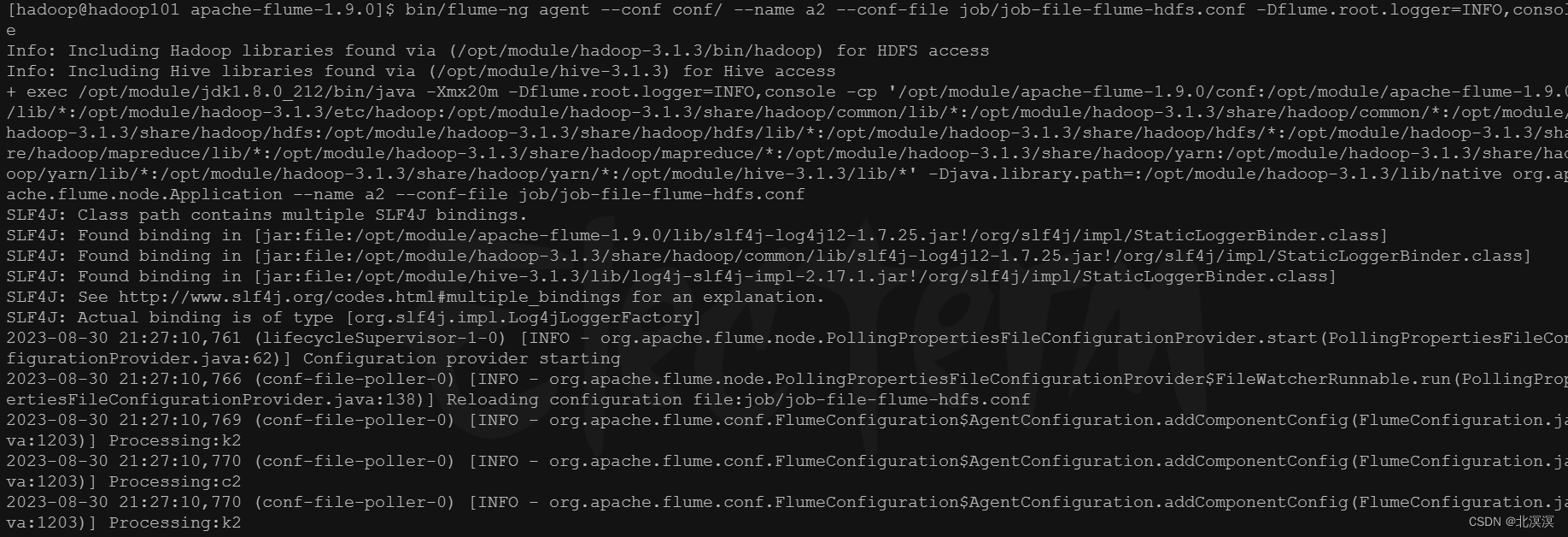 bin/flume-ng agent --conf conf/ --name a2 --conf-file job/job-file-flume-hdfs.conf -Dflume.root.logger=INFO,console