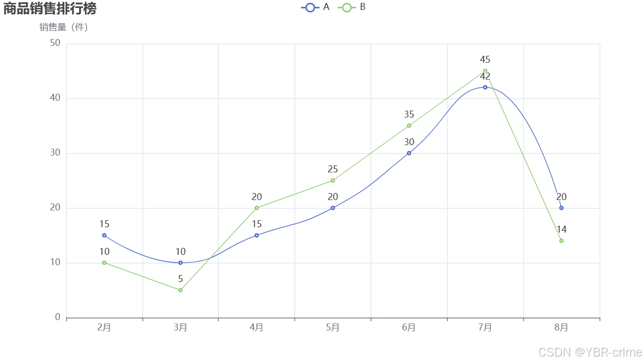 双折线图:展示A/B两类商品的销售趋势对比(带平滑曲线)