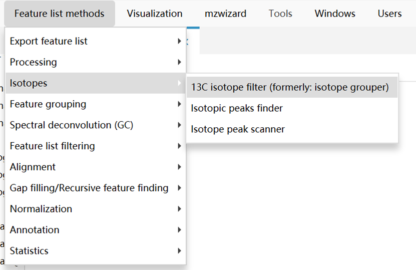 Feature List Methods → Isotopes → 13C Isotope Filter