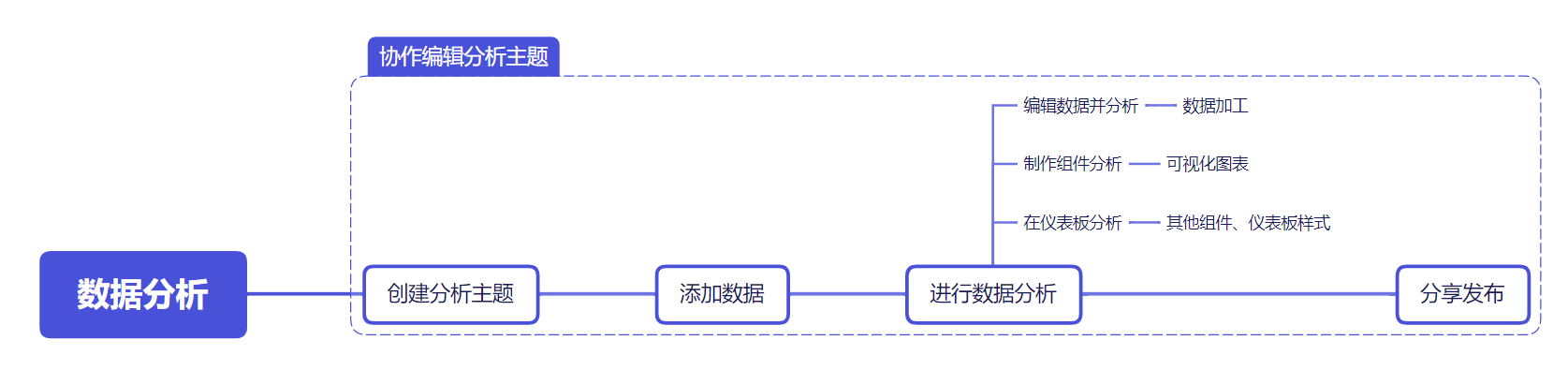 用户可以发布自己分析完的数据集、仪表板,也可以将自己的分析主题分享给其他用户协同编辑。