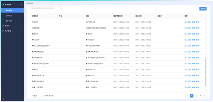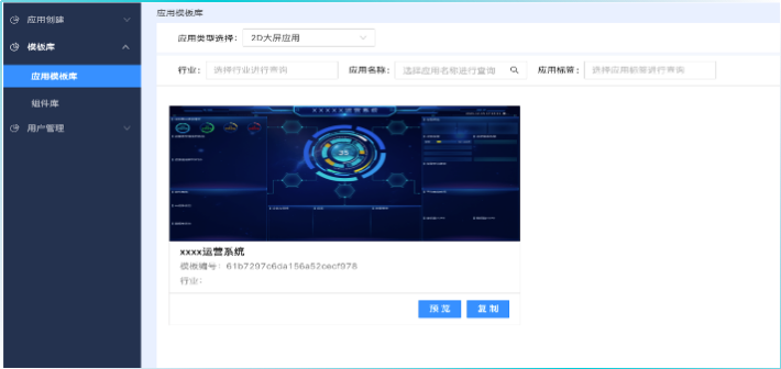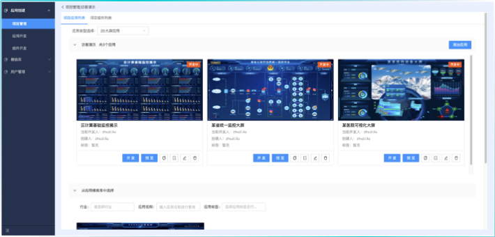 应用模板库收录并展示成熟的大屏模板,其他项目可直接使用模板创建新的大屏应用。开发并脱敏完成的应用,可上传至应用模板库,支持被所有用户直接使用、并开发自己的应用。