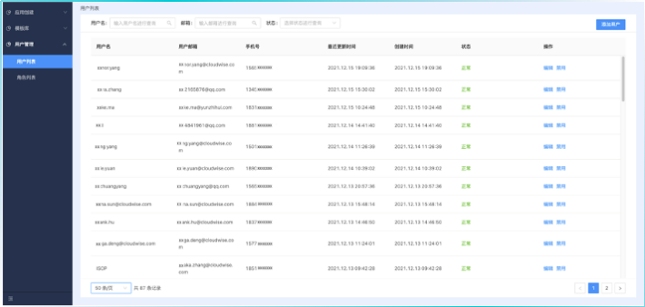 FlyFish 独立登录场景下,支持用户注册账号,在用户列表可以查看和管理所有用户信息。启用状态下的用户才能被授予角色权限。